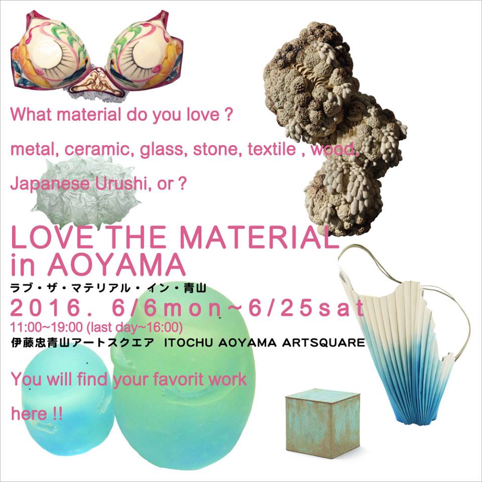 LOVE THE MATERIAL in AOYAMA ラブ・ザ・マテリアル・ イン・青山 2016. 6/6mon~6/25sat 11:00~19:00 (last day~16:00) 会期中は無休です。 伊藤忠青山アートスクエア ITOCHU AOYAMA ARTSQUARE http://www.itochu-artsquare.jp 主催: PEPPER’S PROJECT 共催: 伊藤忠商事株式会社 What material do you love ? metal, ceramic, glass, stone, textile , wood, Japanese Urushi, or ? You will find your favorit work here !! 抱いたテーマゃメッセージの作品化のために素材を選択するのでなく素材を選ぶことからはじまり、その技術の習得を通して作品化する。 それは何よりも素材への愛から始まっている。 とくに工芸やクラフトというカテゴリーを当てはめることに違和感を感じる新しい世代の作家たちにとってそれらは純粋に素材への愛が出発点となったマテリアル・アート。 そこから様々なしなやかな志向と感性の作品がたちあらわれ、それらの作品達から多くの人々はまず愛のメッセージを受けとるだろう。 そんな作品を集めたエキシビション。メタル、セラミック、ガラス、テキスタイル、ストーン、ウッド、漆、その他、 42名の新しい世代のアーティストたちのあらゆるマテリアルのコンテンポラリークラフトをプレゼンテーションします。