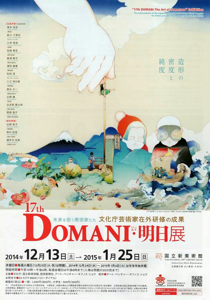 今週の日曜はDomani展の座談会 2015年01月14日 さんにんいじょうごと 0 「海外研修制度での体験」2014年1月18日(日)14:00~パネリスト: 梶浦聖子、濱田富貴、奥谷太一、古武家賢太郎会場 国立新美術館3階下研修室A・B 参加料 無料 定員 50名 事前申込 要http://domani-ten.com/