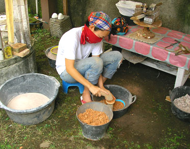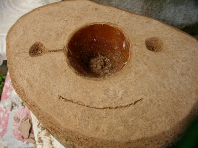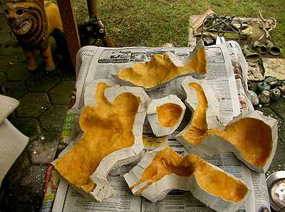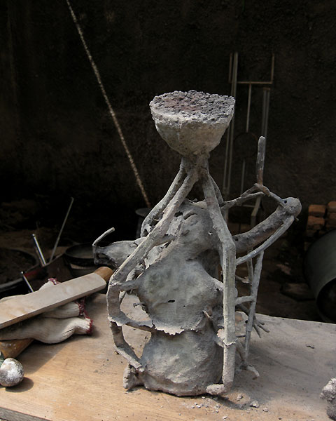 いつか帰る日のことを思いながらの暇つぶし 2010年04月18日 鋳金-Cor-Casting 0 日干し煉瓦を石でごちごち叩き潰して粉にします。石膏と砂と混ぜてロストワックスの鋳型の材料にします。インドネシアの工房の鋳型(砂+石膏)に納得がいかなかったので、なんとなくやってみたら良すぎて止められなくなりました。通気性が良くて、鋳型が作り易くて、丈夫で、そして割り出し易くて、再利用し易い。ごちごち作業はつらいけど、こんないい鋳型剤ありませぬ。日本に持ちて帰るべきか、いや、飛行機の預かり荷物は20kgまで、他にもっと大事な荷物がございます。