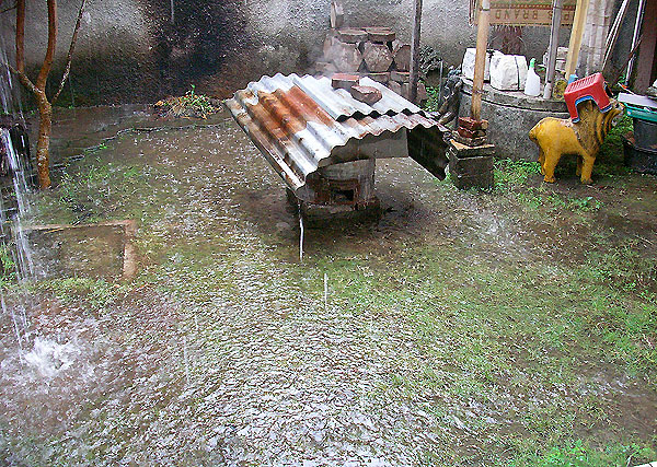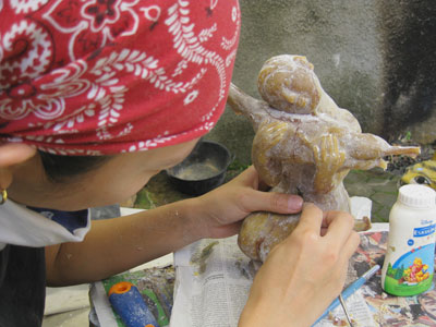 湯道の日 2010年04月17日 鋳金-Cor-Casting 0 湯道を半田ゴテでつける日。後ろにはマンゴの木、その後ろには洗濯物、下にいるのは工房のペットのライオン。名前はアロンソ、素材は陶、用途は貯金箱。最近、剥げてきた。