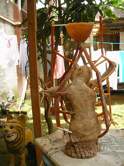 スマイル チョロン 2010年04月24日 鋳金-Cor-Casting 2 大きいのが「湯口」、金属が注ぎ込まれるところ。インドネシア語ではCorong。小さいのが「あがり」、金属が注ぎ込まれた時にここから鋳型の中の空気やガスが出てくる。インドネシア語ではSaluran Angin。