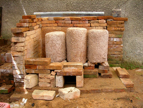 インカ式窯建て 2010年04月27日 鋳金-Cor-Casting 0 インカ式というのはうそだけどこれは最近行き着いた燃料が豆炭と木炭の時の窯建て法。窯の真ん中に窯の奥に通じる送風用の通路をレンガでこしらえる。乙ですねぇ。
