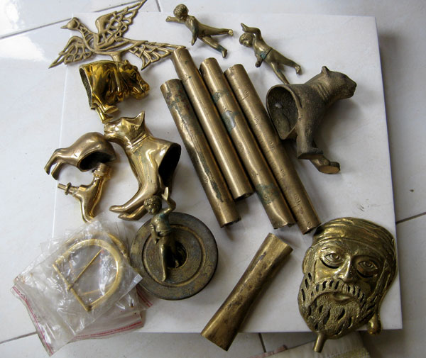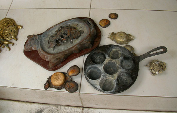 宝探し 2010年04月29日 鋳金-Cor-Casting 0 古地金屋の金属の値段がまた上がった。真鍮 Rp.44,000-ブロンズ Rp.125,000~Rp,150.000- 真鍮の地金は熔かすのがもったいないお宝が出てくるから多めに購入しなければなりません。今日のお気に入りは黄金のカバと猫とヒョウ。残念なのはどれも上半身しか入っていなかったこと。ひとつあった下半身はどうやら別の動物のものでした。
