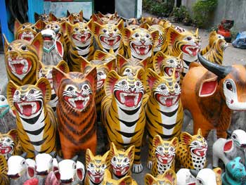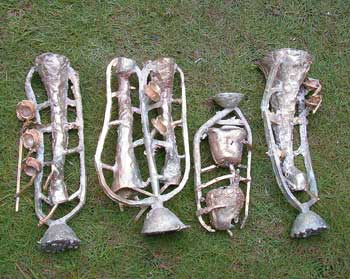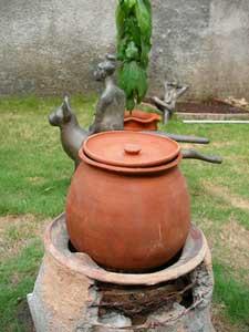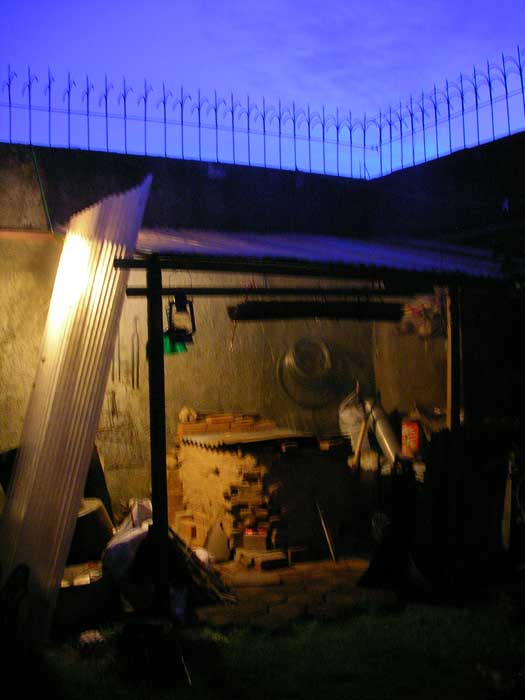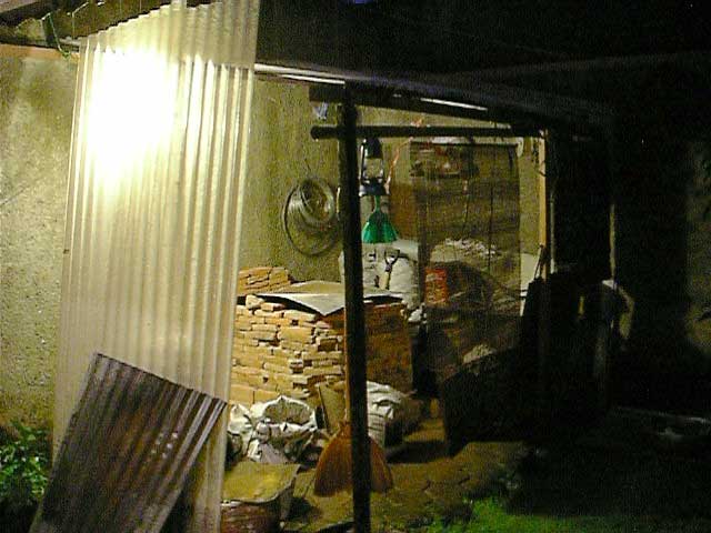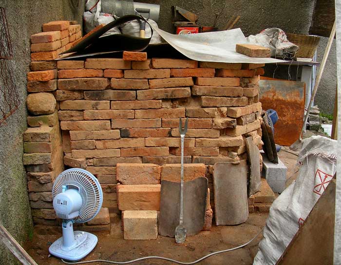 鋳型焼成 2009年02月25日 鋳金-Cor-Casting 1 今日から鋳型を焼きます。窯は日干し煉瓦とトタンでできていて、燃料は木炭と豆炭。3つの焚き口から交互にふたつの扇風機を当てます。雨季なので湿ったレンガや炭が乾くのに余計な時間がかかります。