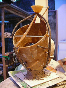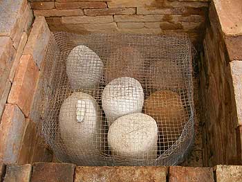 窯 2008年11月23日 鋳金-Cor-Casting 0 手塩にかけて育てた鋳型が7個も丸焼きになりました。中に入っている蝋でできた原型が溶けて消え去り、鋳型は焼成されます。ついでに日干しレンガは焼きレンガになったのか、、?