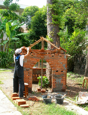 BIENNALE JOGJA 開催中 2008年01月21日 ふたりごと 1 2005年のジョグジャビエンナーレでは、竹とビニールを使って小屋を作りました。2006年、スウェーデンでは太い竹が手に入らないので白樺の木で作りました。今回のジョグジャビエンナーレではレンガで作りました。ここまでやってきて3びきの子豚の存在に気付いたときはもう手遅れでした。わたしの思考様式はぶた。
