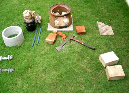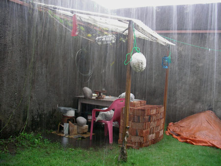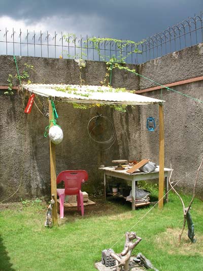 鋳造工房Jagung Bakar 2008年02月20日 鋳金-Cor-Casting 1 半年間だけですが、鋳造工房Jagung Bakar-ジャグンバカールを開こうと思います。従業員、わたし。設備、いまのところ坩堝ひとつ、七輪ひとつ、耐火レンガふたつ。屋根しかないのに、約2畳の面積を誇る鋳造工房が我が家の庭にオープンしました。おめでとうございます。