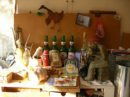 蜂の巣 2008年04月29日 ふたりごと 1 制作場の机は山盛りになりましたので、そろそろ大掃除をしようと思います。机の下に小さな蜂の巣があったので、机ごと庭の隅っこに運び、長い棒でつんしたら、ポロと落ちた。