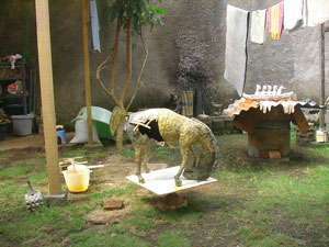 犠牲の羊 2010年10月17日 鋳金-Cor-Casting 4 来月はイスラムのIDUL ADHA犠牲祭があるので隣の家では鶏を飼い始めました。毎朝、コケコッホォーという声が聞こえてきます。私は犠牲祭に捧げる羊を作りました。私は誰に捧げるの?犠牲祭までには仕上がるでしょう。