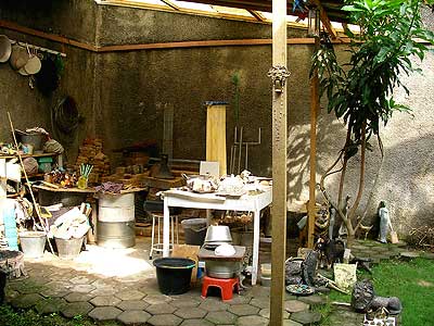 イキモノスキダケドネ、 2009年12月01日 ふたりごと 2 工房の床に今朝突然、高さ30cmの土山が出現した。棒でつんつんしてみると、中にはシロアリらが住んでいた。その土山と周辺にシロアリ退治薬を霧吹きでシュッシュすると、今度は窯の裏からヘビが出てきた。諦めて、石膏型にロウを流すことにして型を開けたら、クモの子供たちがいっぱい出てきた。雨が降ると、大きなカエルと小さなカエルがどこからともなく出てきて徘徊する。マンゴの木にいつもくっついているカメムシ。生き物好きだけど、こんなにいなくてもいいかも。昨日、玄関前に作品を展示していたら、猫と羊が見に来た。あああううう。猫は金魚みたいな匂いがした。