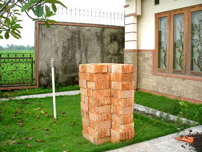 BIENNALE JOGJA 開催中 2008年01月21日 ふたりごと 1 2005年のジョグジャビエンナーレでは、竹とビニールを使って小屋を作りました。2006年、スウェーデンでは太い竹が手に入らないので白樺の木で作りました。今回のジョグジャビエンナーレではレンガで作りました。ここまでやってきて3びきの子豚の存在に気付いたときはもう手遅れでした。わたしの思考様式はぶた。